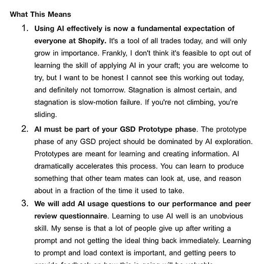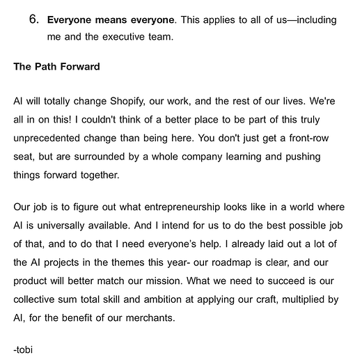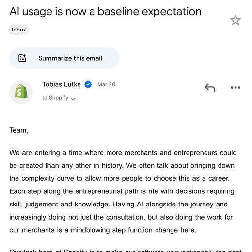 Using AI internally: Shopify is adopting AI across functions and pushing for it. Tobi’s industry trend setting memo is well documented. It is very clear: “Reflexive AI usage is now a baseline expectation at Shopify”.